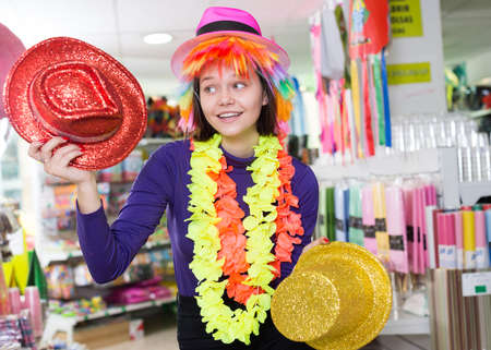 Girl looking for funny hats in store