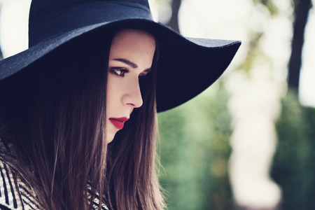 Beautiful Young Woman in a Hat Outdoors. Profile