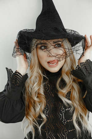 Smiling young woman portrays a witch for halloween in the studio. Celebration on October 31st.