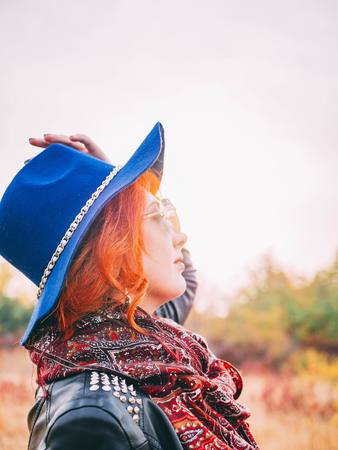 Side view portrait of red-haired woman in a leather jacket, blue hat, scarf and glasses holding her hat on the sunset in the field