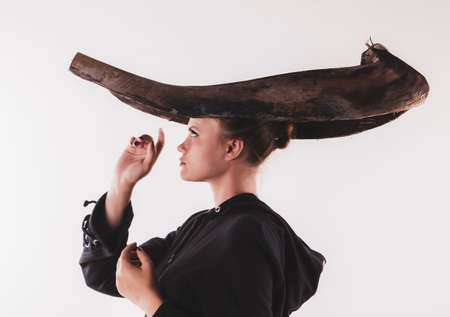 Portrait of young woman in black clothes holds a piece of bark in the form of an elegant headdress. Natural materials, dry plants and personal accessories.