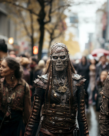 Halloween costume festival, urban parade of disguised participants. Illustration generated by AI.