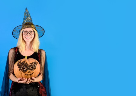 Beautiful girl in witches hat and costume. Jack lantern pumpkin in hands. Halloween witch. Smiling witch with magic Pumpkin. Halloween art design. Halloween horror concept. Halloween style clothes.