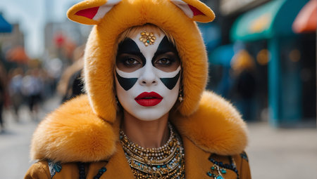 Colorfully dressed performers showcase their elaborate costumes and makeup during a festive celebration in an urban environment, radiating joy and creativity.