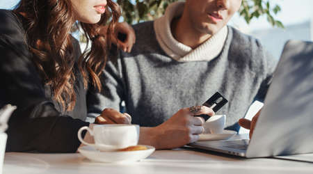 Detail of a customer offering credit or debit card for shopping payment in the store.