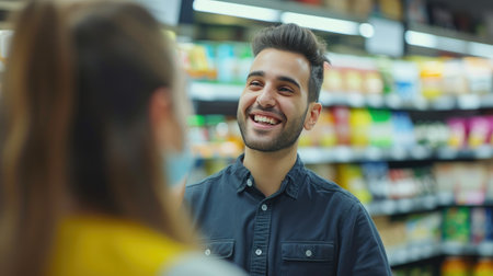 Male cashier with curly hair is happily engaging with customer at grocery store checkout, creating a warm atmosphere of customer service and connection
