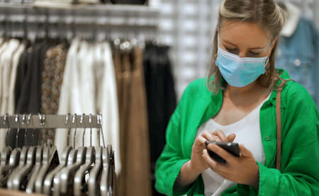 Photo of young attractive brunette woman with a short haircut in a white sweater chooses stylish and casual clothes in a store in a shopping center and uses mobile phone