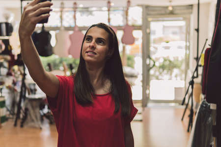 Ecommerce and sell online. Woman taking picture of clothes in the shop. Second hand, Selling used clothes.