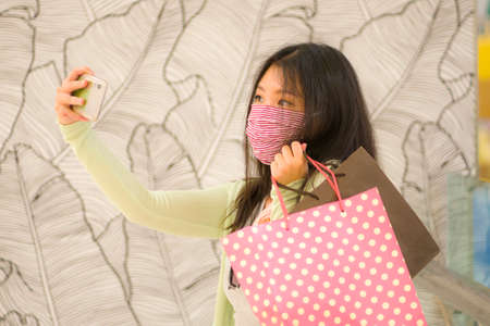 Portrait of smiling young woman buying clothes in luxury boutique or shopping mall and paying via smartphone