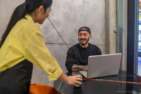 young asian women cashier worker standing near cashier counter in black apron and making payment and giving goods to customer in grocery store or modern market