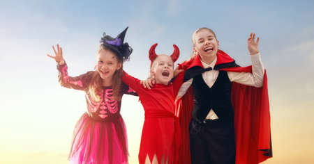 Kids dressed as vampire, witch, superhero and ghost for Halloween, bright joyful tones