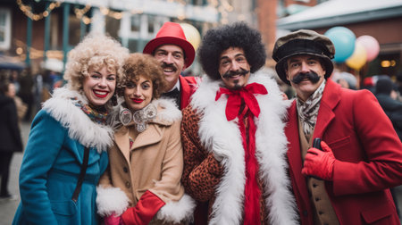 five people in vibrant winter clothing at an outdoor event, showcasing a mix of textures and colors in their attire.High resolution AI generated