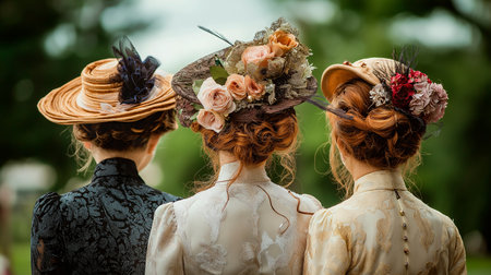Models dressed in exquisite 19th-century attire pose gracefully in an elegant indoor space, showcasing intricate fabrics, accessories, and vintage hairstyles, highlighting a refined aesthetic.