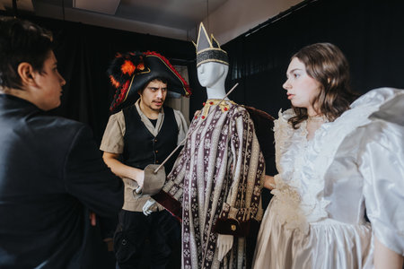 Young actors in costume rehearsing a theatrical play scene with a dressed mannequin on stage
