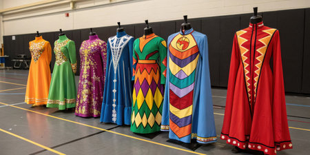 S Costume Variations Create an image displaying a variety of s costumes showcasing different colors and patterns lined up as they prepare for the performance vibrant and.