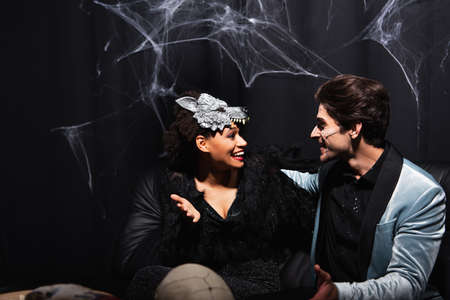 cheerful african american woman in wolf mask gesturing while talking to man in halloween makeup