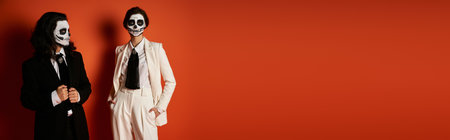 woman in sugar skull makeup and white suit holding hands in pockets near scary man on red, banner