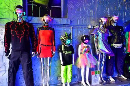 A display of trendy clothing items with subtle particle designs showcasing the intersection of science and fashion