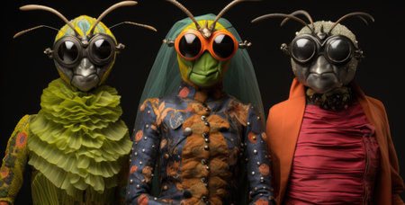 Five performers stand in a row, each wearing unique costumes with metallic hoods and flowing garments. The background highlights their striking appearance against a soft evening sky.