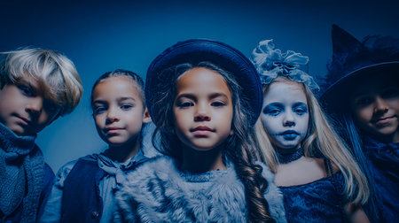 Children in Halloween costumes posing for a portrait. A group of children dressed up in various Halloween costumes, looking directly at the camera with a blue background. Spooky fine art.
