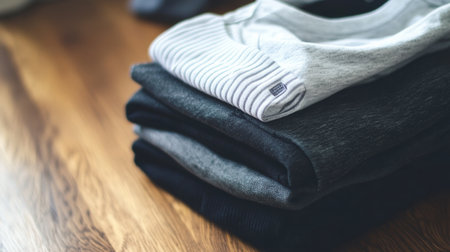 A collection of minimalist sportswear, folded and organized on a smooth table in a well-lit, contemporary environment.