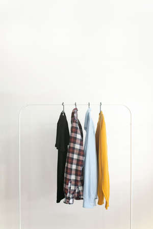 Rack with capsule clothes over white background Minimalism concept