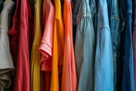 A colorful display of vibrant shirts hanging on wooden hangers. This image captures a stylish arrangement showcasing various bold colors, perfect for fashion-themed projects.