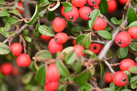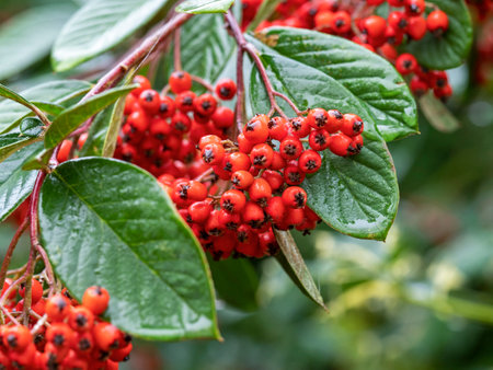 Cluster of small vibrant red cotoneaster berries surrounded by shiny green foliage. Autumn garden plant with colorful berries detail on natural background.