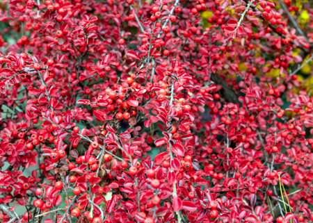 Many red fruits on the branches of a cotoneaster horizontalis bush in the garden in autumn. Natural background