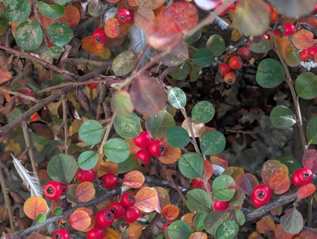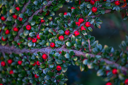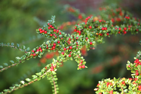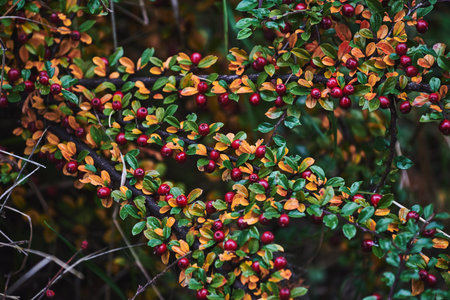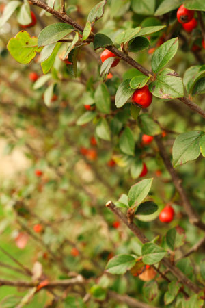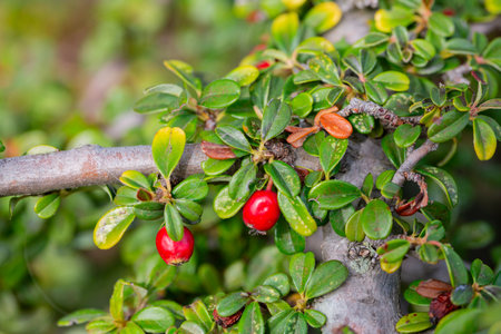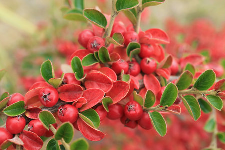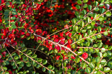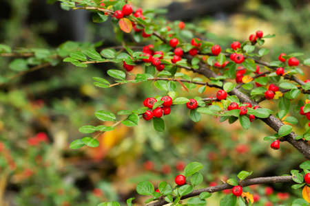 Close-up of cotoneaster horizontalis plant. Background with garden plant in natural colors.