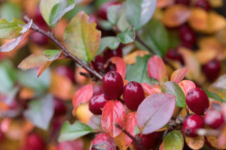 Beautiful branch of Cotoneaster divaricatus Rehder & EH Wilson in autumn. Selective focus on green-yellow leaves and red fruits of Divaricate cotoneaster