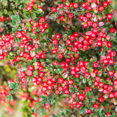 Autumn fall berries background. Cotoneaster horizontalis, rockspray cotoneaster plant with ripe red berries. Fruits of the dwarf medlar, cotoneaster horizontalis