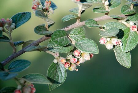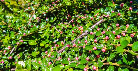 Small pink flower buds of a cotoneaster horizontalis bush in the garden in spring.