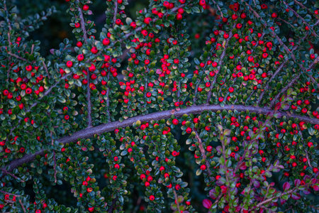 Nature background. Red Berries of Cotoneaster. Cotoneaster horizontalis plant with ripe red berries
