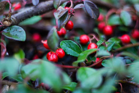 Bush with lots of red berries on branches, autumnal background. Close-up colorful autumn wild bushes with red berries and cold green leaves in the park. Shallow depth of field