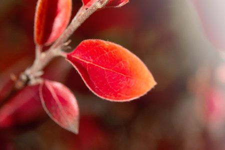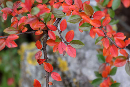 Autumn red-orange cotoneaster leaves in the garden. Ornamental plant for gardening