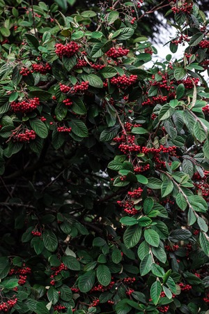Pyracantha coccinea or firethorn bush with red ripe berries close-up