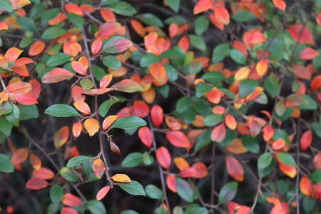 Close-up of Cotoneaster bush on winter with green and red leaves on branch
