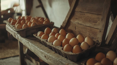 This warm and inviting image captures fresh farm eggs arranged neatly on a rustic wooden table, evoking a cozy country atmosphere perfect for food lovers.