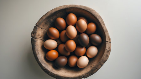AI Generated. Top view of a wooden bowl filled with brown eggs