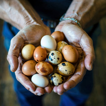 the hands of an invisible person hold fresh chicken and quail eggs from the farm