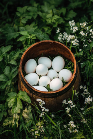 A rustic bucket filled with various farm-fresh eggs sits amid lush greenery and cheerful wildflowers, showcasing a serene countryside setting during daylight.