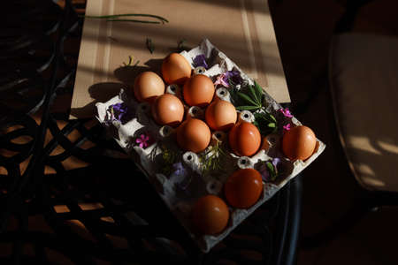 A captivating arrangement of fresh brown eggs in a carton, placed on a rustic wooden table adorned with delicate floral elements and herbs.