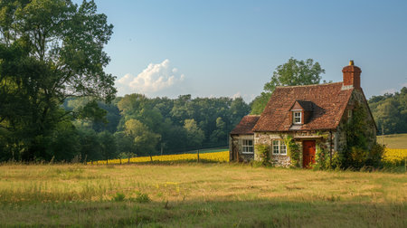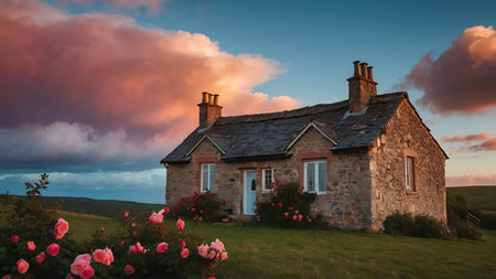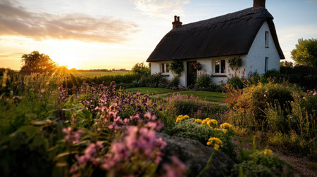 A charming countryside cottage surrounded by blooming flowers