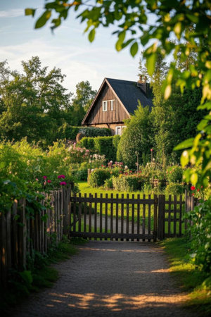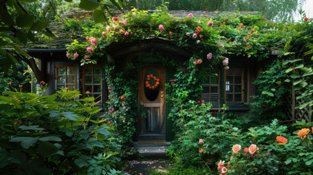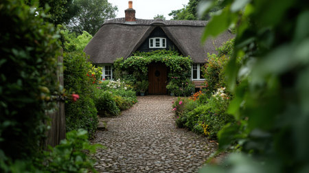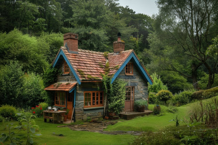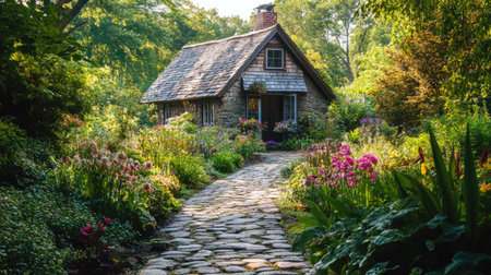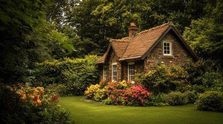 A picturesque cottage nestled in a lush garden filled with vibrant flowers and greenery. This serene outdoor scene captures the essence of rural tranquility.