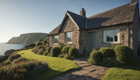 A charming stone cottage with a green door stands on a grassy cliff overlooking a calm sea at sunset. The house features a slate roof, small windows, and manicured bushes in the front yard. The picturesque scenery showcases the beauty of the rugged coastline.