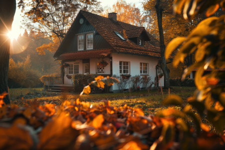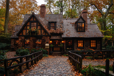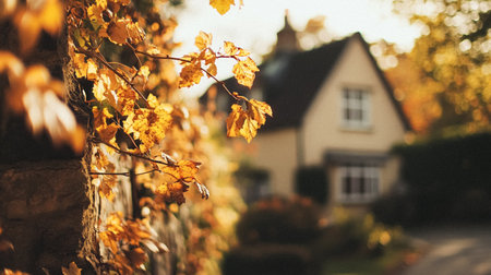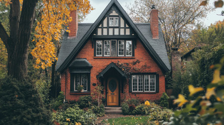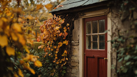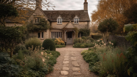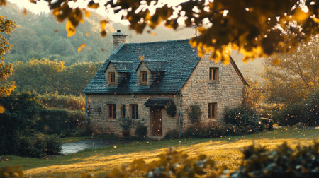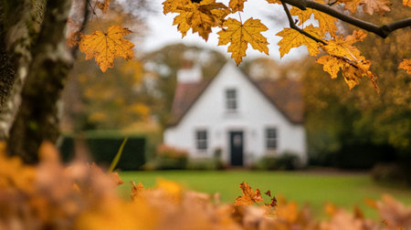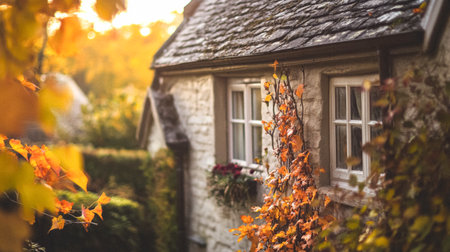 Autumn cottage in the English countryside style, old village architecture, autumnal nature beauty
