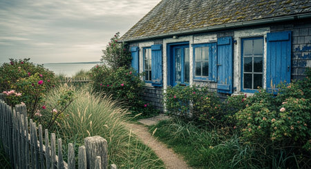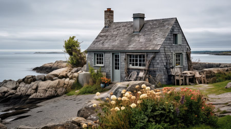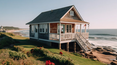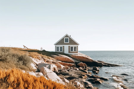 Perched on a coastal ridge, a lonely cottage enjoys a serene view of the ocean. AI Generated.