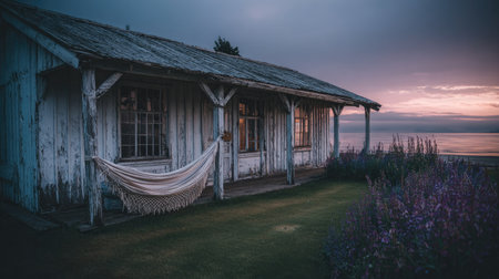 An aged wooden cabin stands near the water under a dusky sky. A hammock hangs from the porch, suggesting relaxation. The scene features muted colors, with light reflecting on the water. Suitable for various projects, this image could be used for promoting travel or conveying serenity.