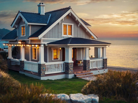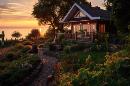 Capture the serenity of this exquisite coastal cabin at sunset. Lush gardens frame a charming wooden home, with the golden horizon in the background.